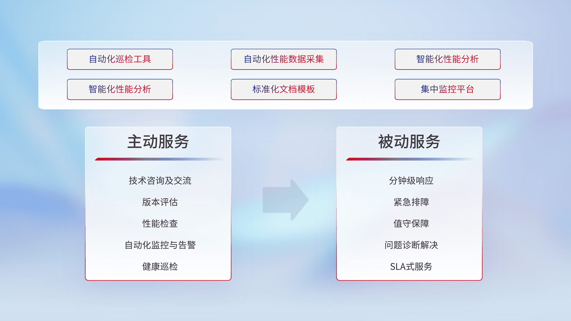 智能化工具和标准化文档,,,,保障服务质量,,提供主动服务(包含技术咨询、、、、版本评估、、、、性能检查、、、自动化监控与告警、、健康巡检)和被动服务包含(分钟级响应、、、紧急排障、、、值守保障、、问题诊断解决、、、SLA服务)。。